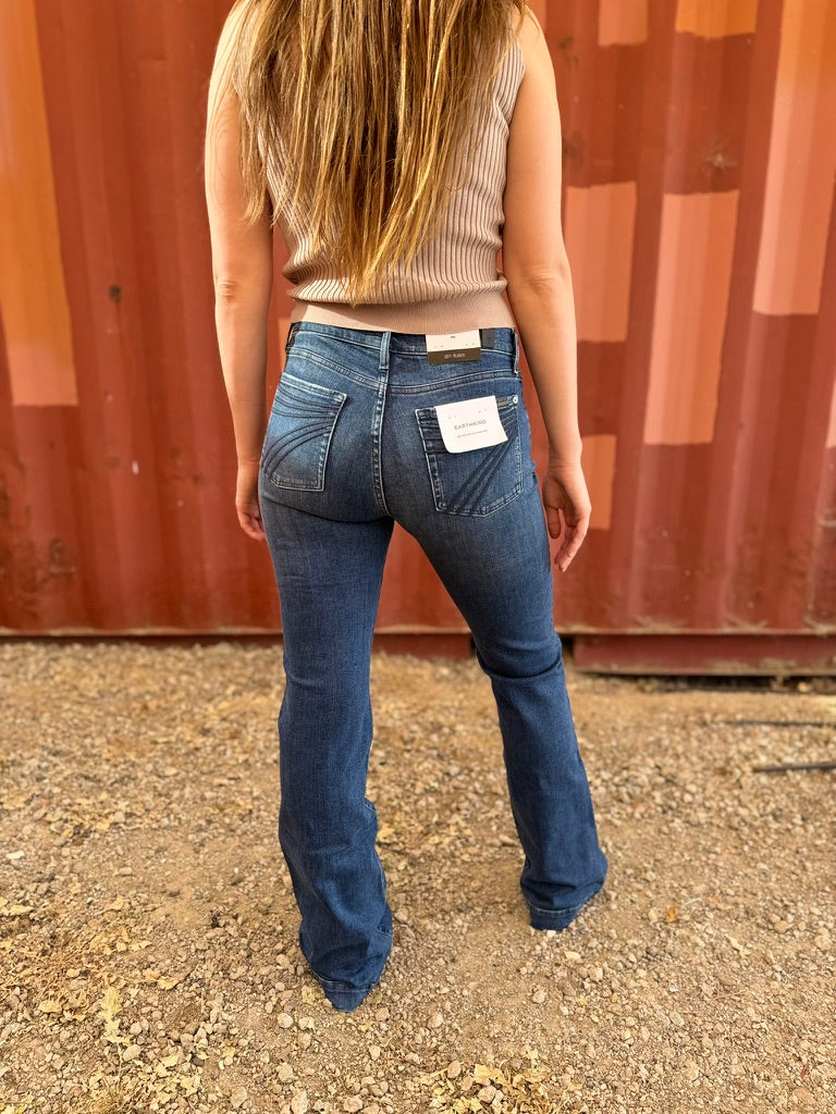 Ride into style with the Custom Cowboy Cut Dojo in Adventure! Made for BarnKat and featuring a slim illusion design with an extra long 36" inseam, this medium-dark wash denim offers a tonal 7 on the pocket and classic Dojo trouser bottom seam.