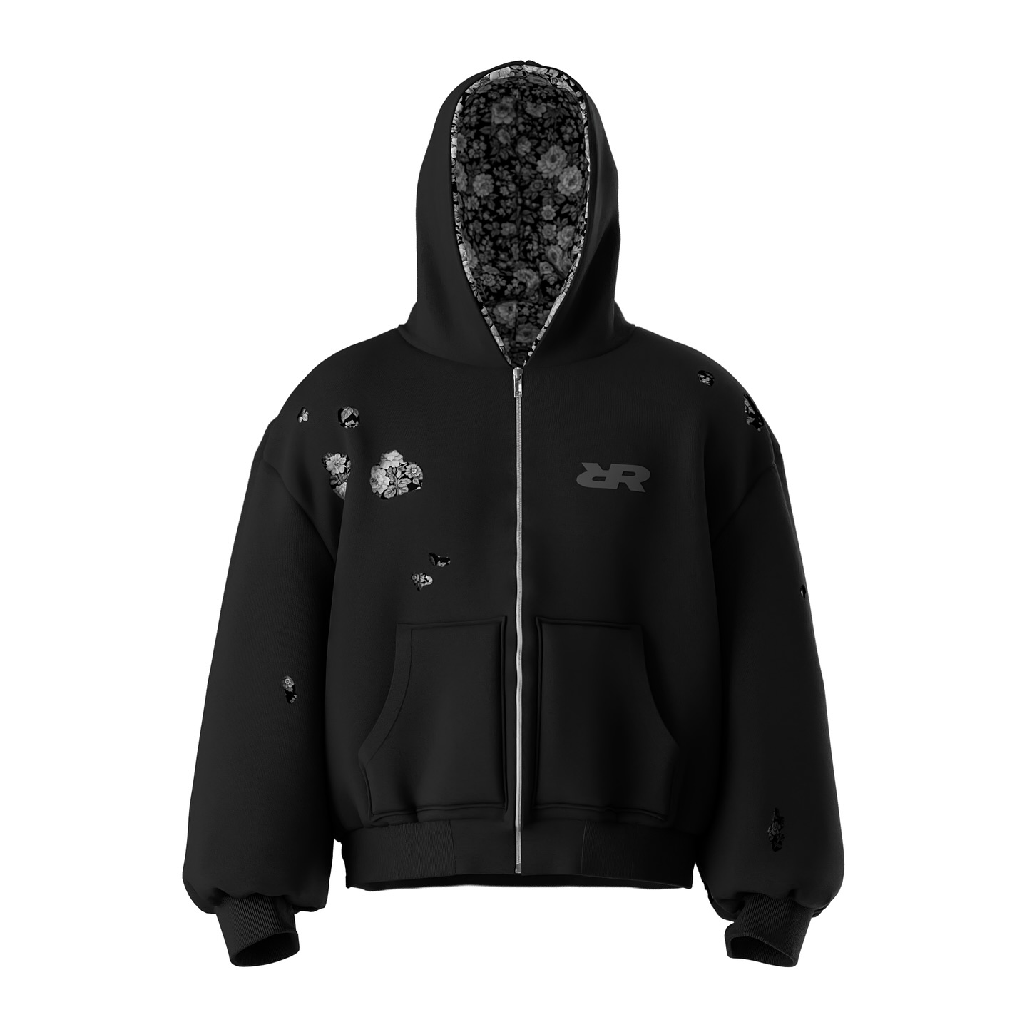 This is our classic hoodie made of double-layer thick French terry. Embroideries on both sides
