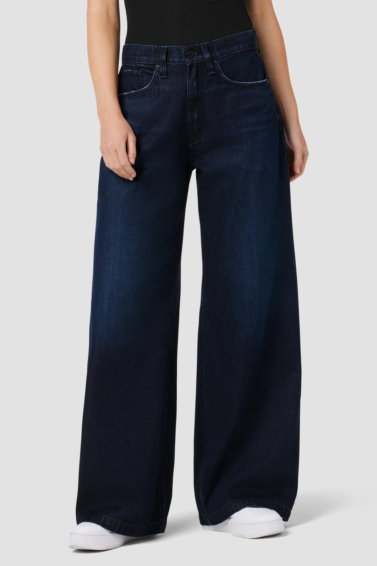 Experience comfort and style with the Jodie High-Rise Wide Leg Jeans in Moonlit. Made from lightweight Arioso denim, these roomy jeans come in a dark indigo wash with distressed edges and a clean hem. Perfect for any occasion, with classic five pocket details. Get ready to rock the moonlight in these versatile jeans!