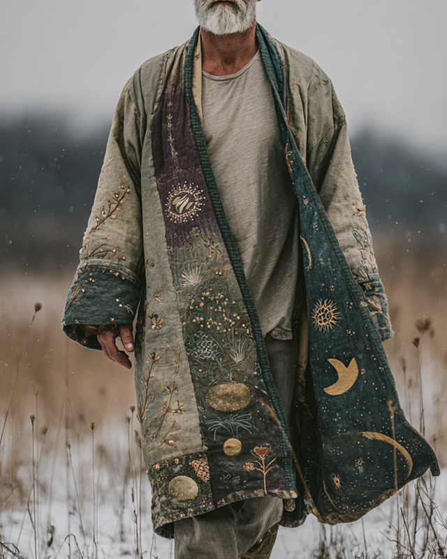 Men's casual and comfortable star and moon 3D embroidered contrast color stitching linen jacket 5f51