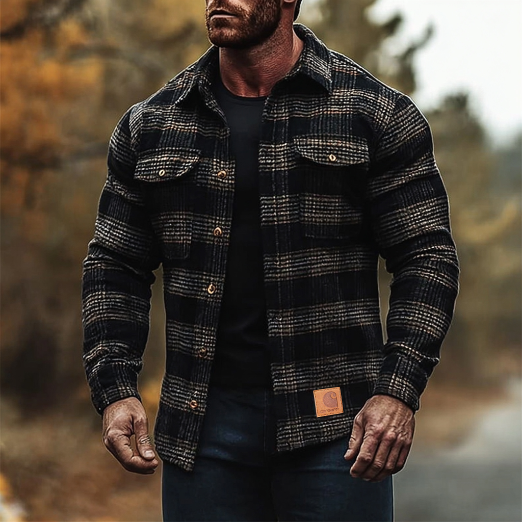 • Design Elements: Chest pockets with button closures, plaid pattern, woven label patch on the left side