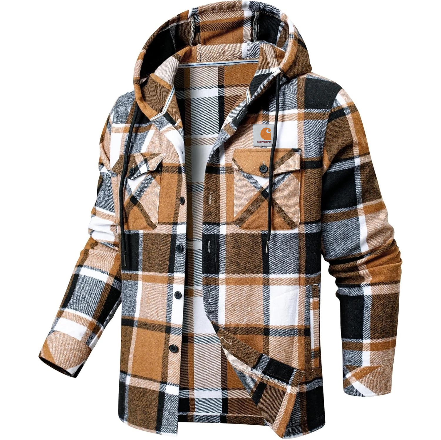 • Design Elements: Chest pocket with button closure, hooded design, plaid pattern