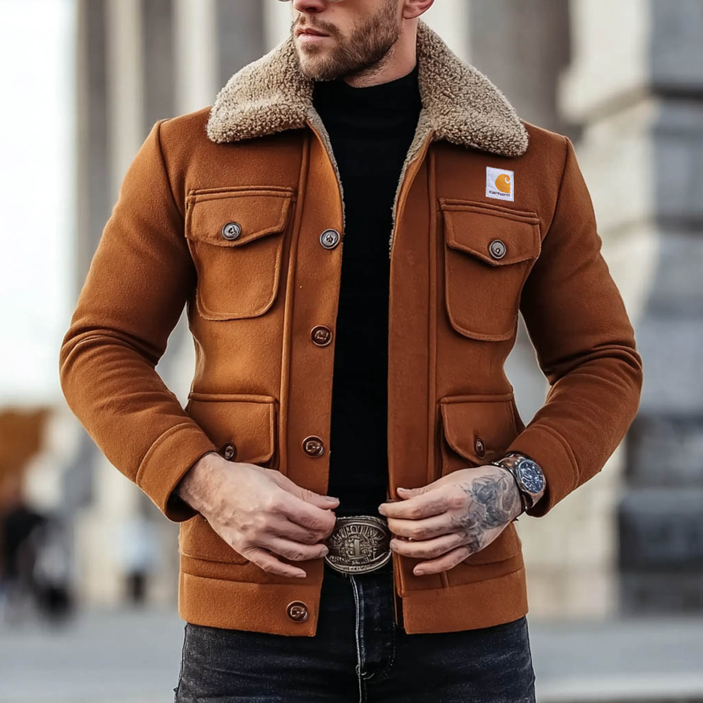 • Design Elements: Two front buttoned pockets, faux fur collar, classic button closure
