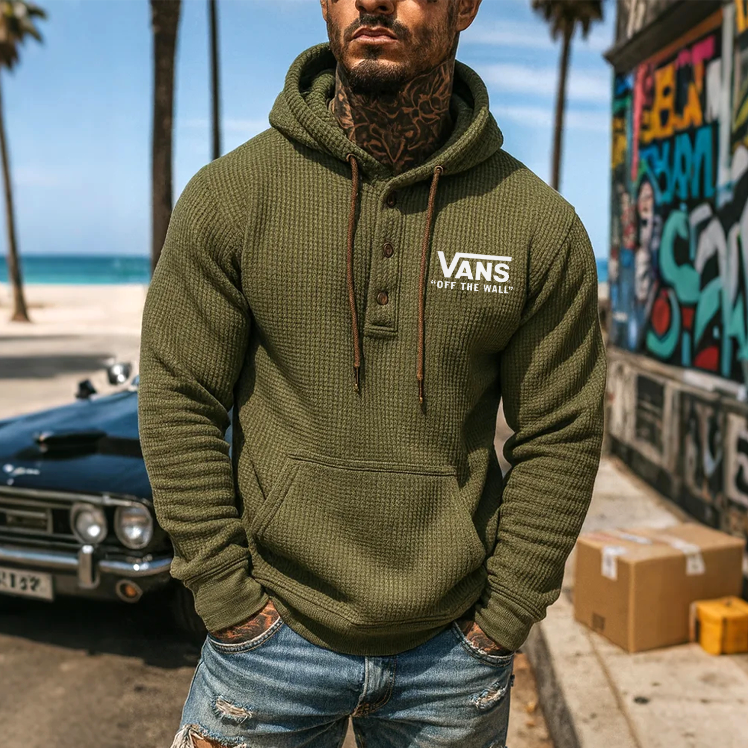 • Design Elements: Button Closure, Hoodie Design, Chest Logo Print