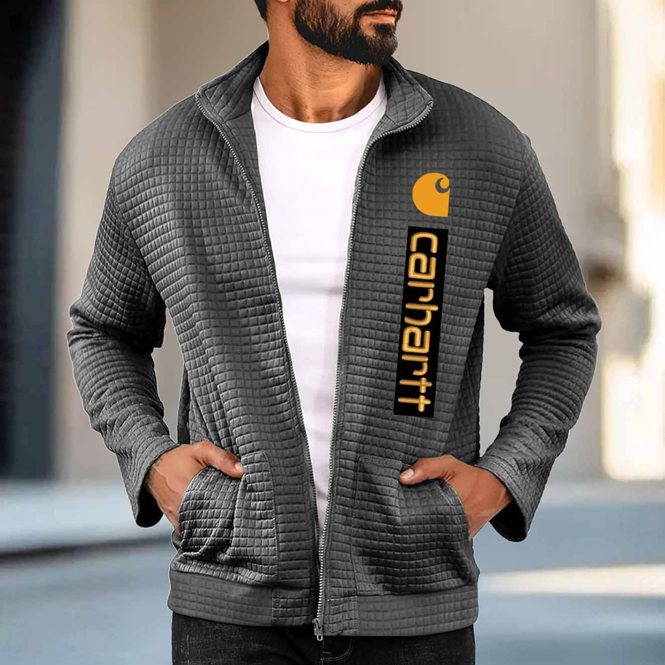 • Design Elements: Vertical logo placement, quilted texture, zippered closure