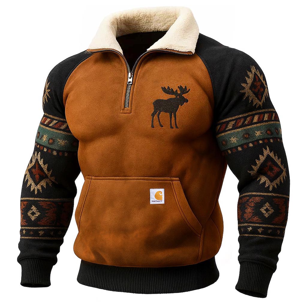 • Design Elements: Moose Embroidery on Front, Ethnic Patterns on Sleeves