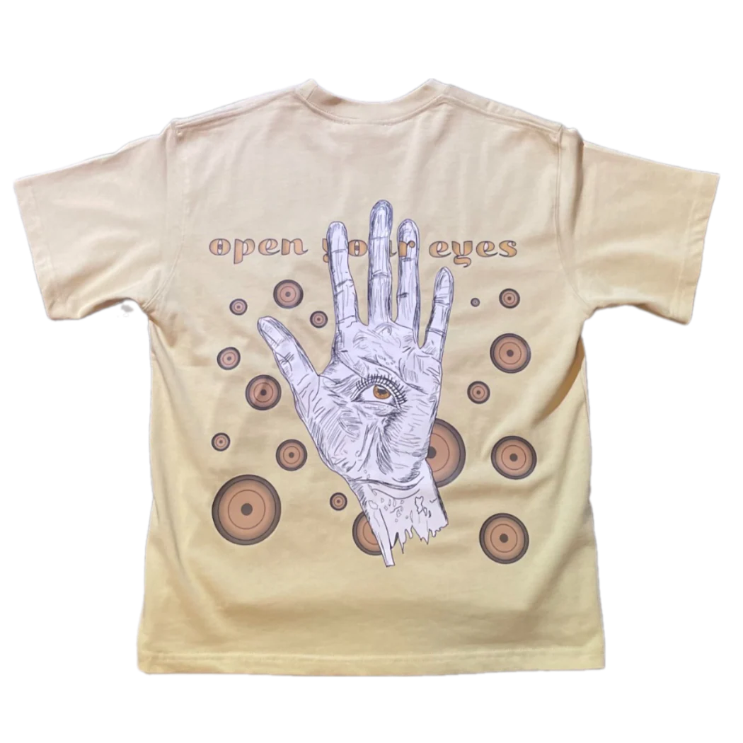 Oversized heavyweight cotton T-shirt. Embroidered front print. Large back Print. Custom neck tag.