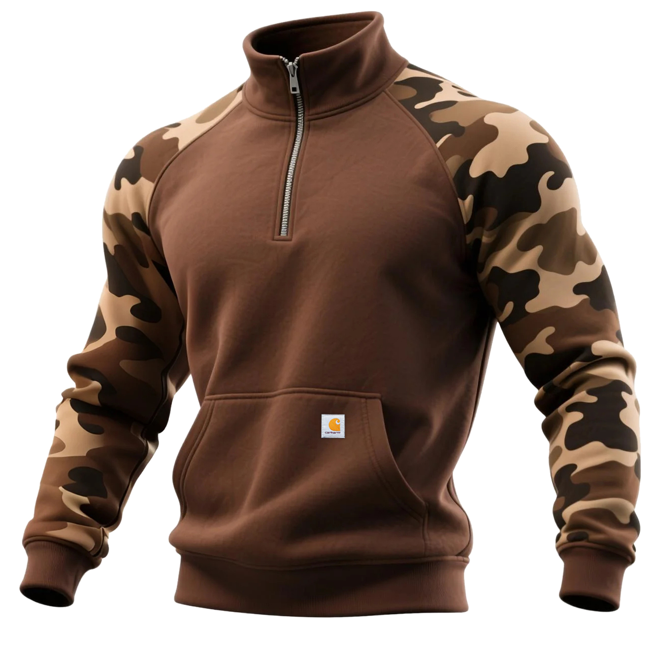 • Design Elements: Camouflage sleeve pattern, quarter-zip closure, front pocket with logo patch