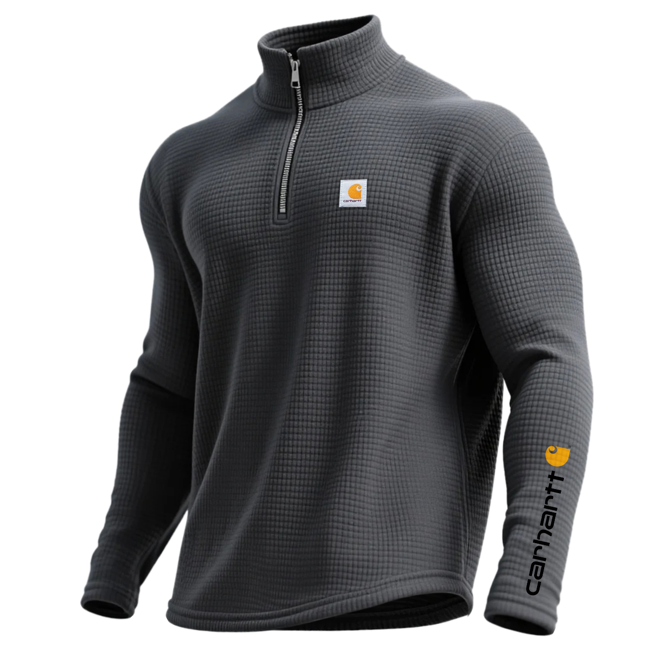 • Design Elements: Half-zip closure with a secure fit, subtle logo patch on the chest, and brand text along the sleeve