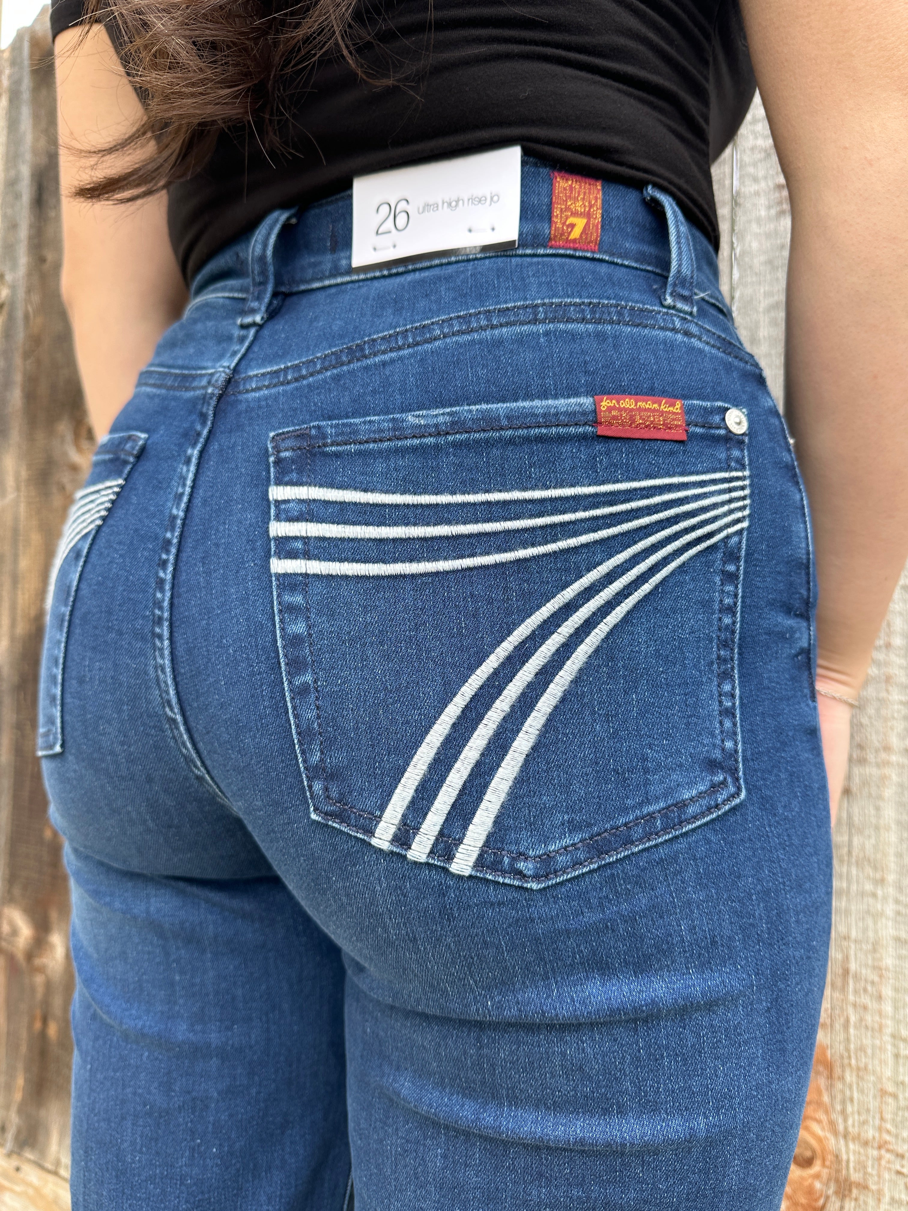 The Ultra High Rise Jo in Crater features a high waisted sleek solid dark wash and the all time customer favorite white stitching 7 on the back pockets! Dark wash, stretchy, wide leg, AND has the 7’s on the back pockets? What’s not to love!?