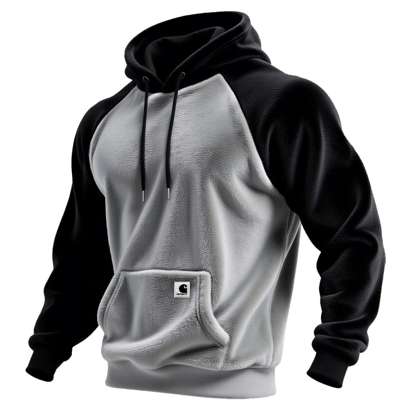 • Design Elements: Contrasting sleeve and body colors, front pocket with logo patch