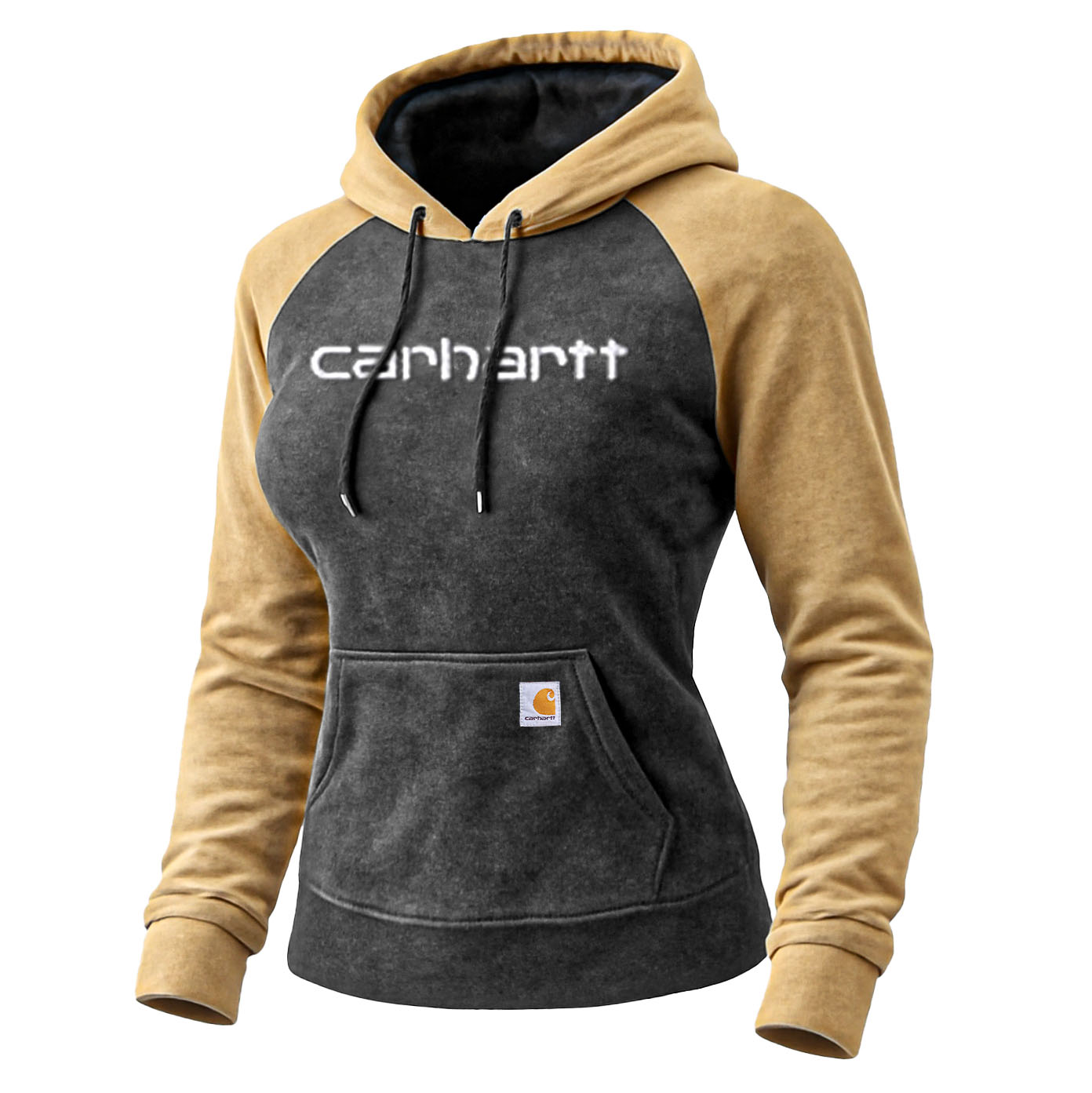 • Design Elements: Contrasting sleeve and hood colors, front pocket with logo patch, bold text print on the chest